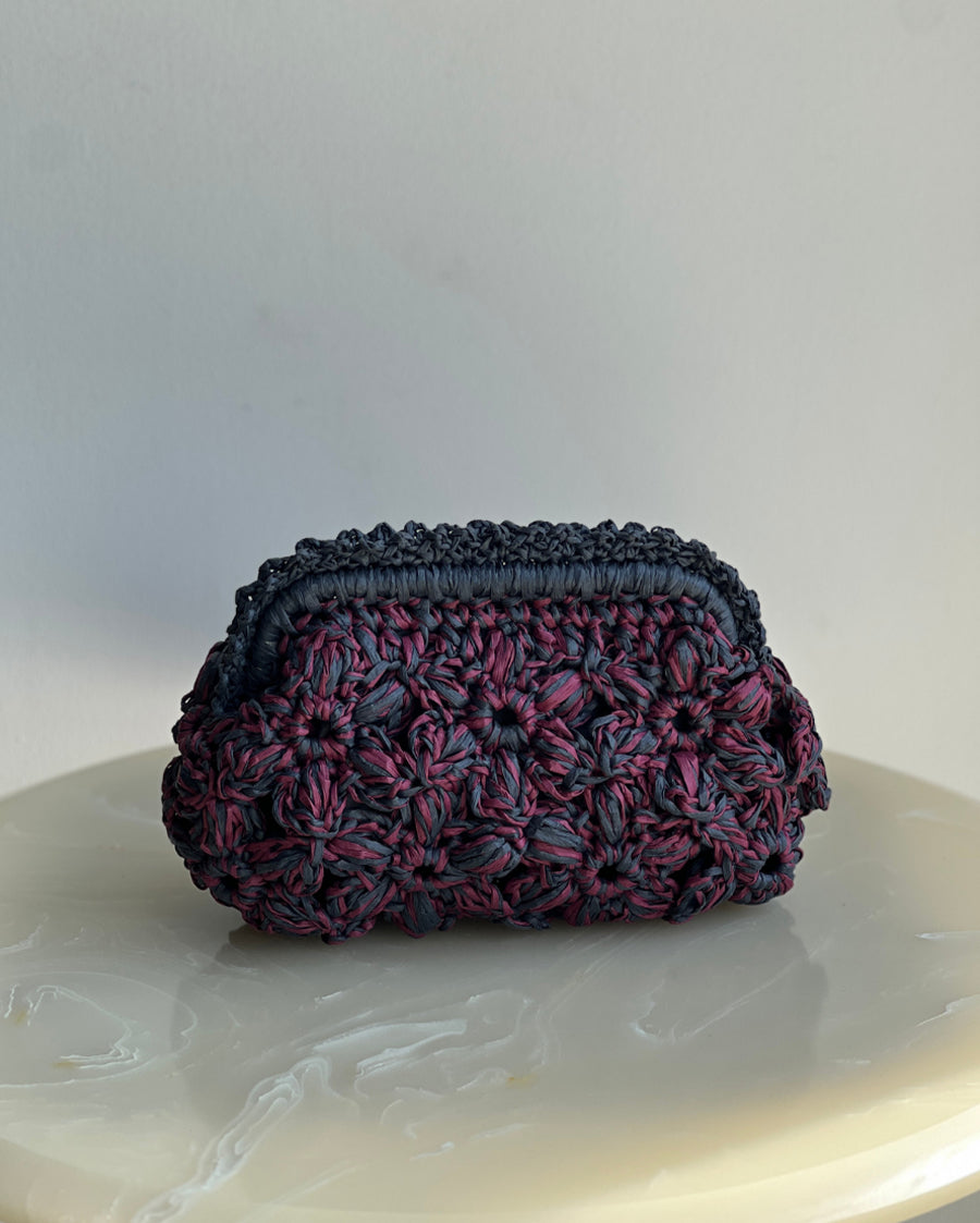 Hand-Crocheted Recta Floral Bag in Raffia Pink with Grey Handle