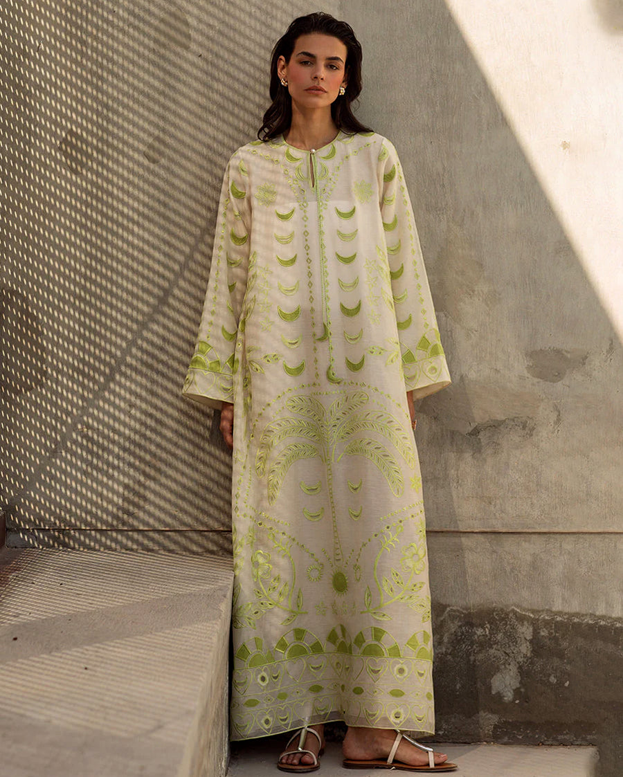 A kaftan that captures celestial charm with a modern gaze, Dahlia is crafted in sheer ivory khaddi corduroy and hand-embroidered with crescents, palms, suns, and delicate florals. Appliqué and eyelet accents unfold like a dream across its length, creating an ethereal narrative of artisan craftsmanship.