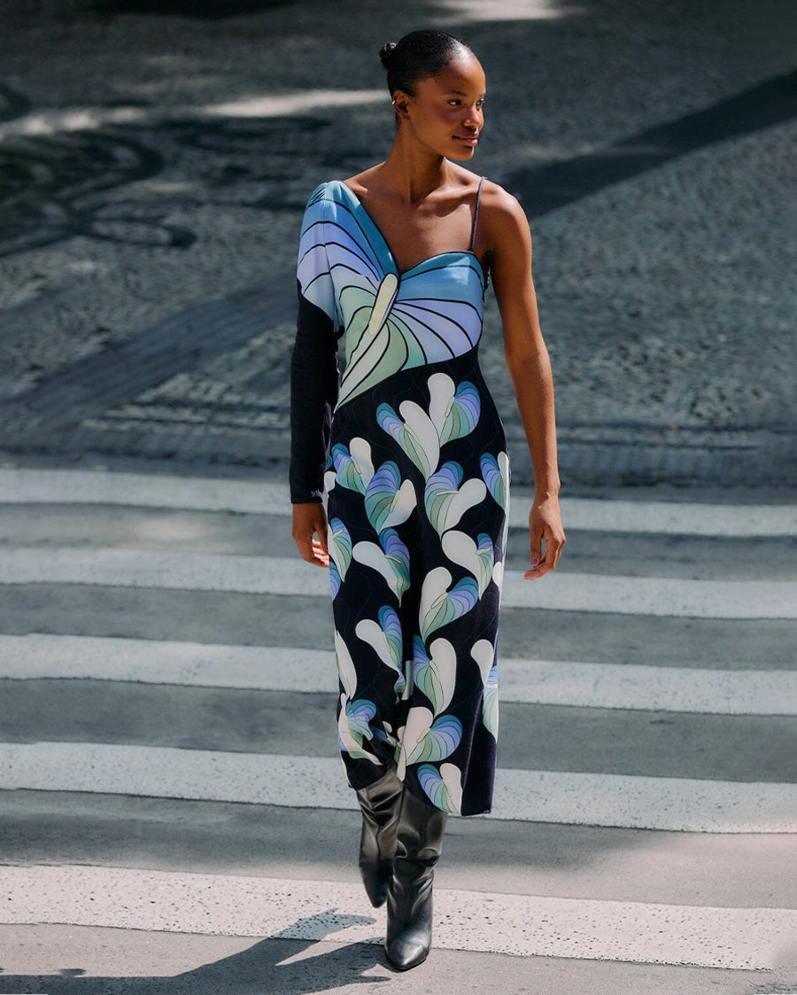 The Black Lovely Anthurium One-Shoulder Maxi Dress from FARM Rio charms with its asymmetrical neckline and captivating one-sleeve silhouette. Embracing boldness, the dress showcases a lively anthurium-inspired print in soothing shades of blue, green, and cream against a black backdrop. The flowy maxi length and artistic patterning create a playful yet elegant rhythm, inviting warmth and confidence into every step you take.