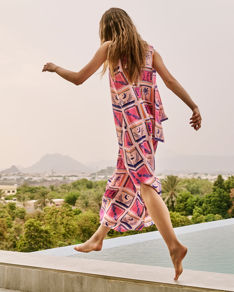 Beth Dress with Postcard Inspired Graphic Palm and Geometric Motifs in Pink
