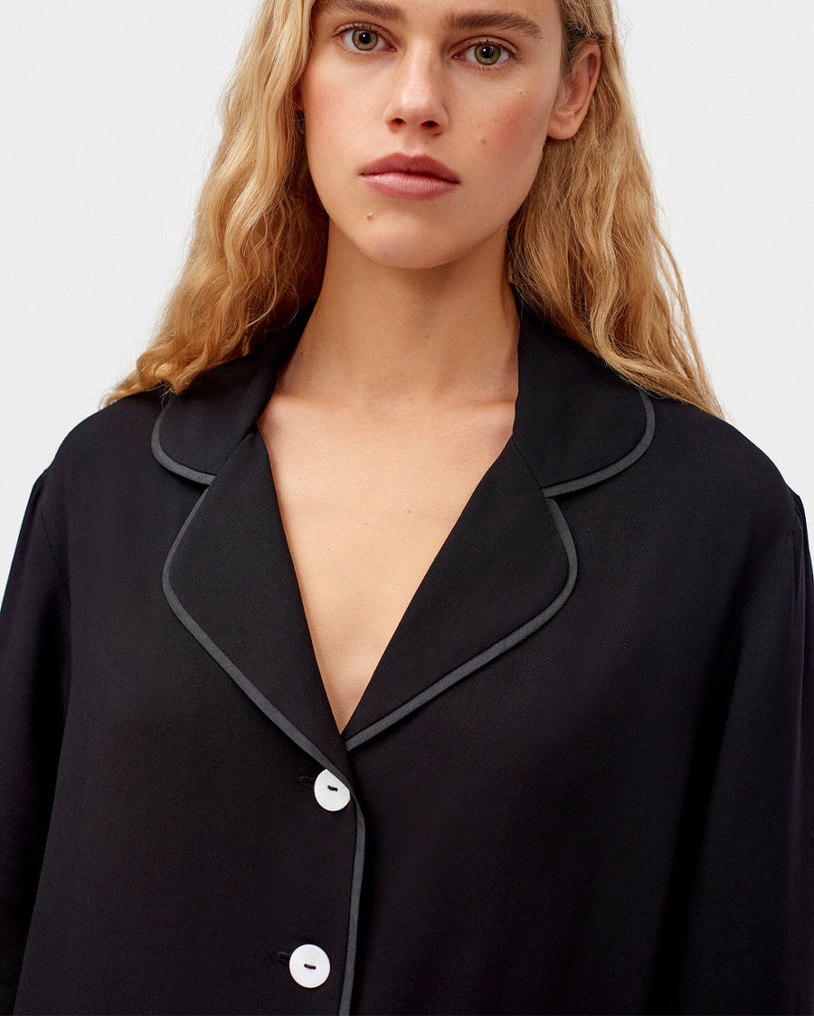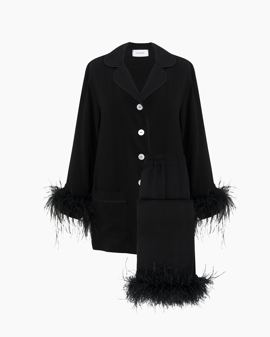 A relaxed pajama shirt and pants set are cut from soft black certified viscose, trimmed with a double layer of detachable ostrich feather cuffs. The shirt features a cropped sleeve length, as well as tonal piping at the rounded collar, button closure and pockets. The pants sit below the hip with a comfortable elastic waistband and straight silhouette. The set pairs just as easily with slippers as it does with heels.