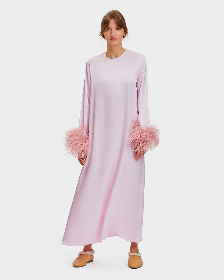 Pink maxi dress with a loose silhouette in gentle, breathable EcoVero™ rayon. The round neck closes at the back with a button loop, while the sleeves are finished with detachable ostrich feather cuffs. Designed to wear day or night.