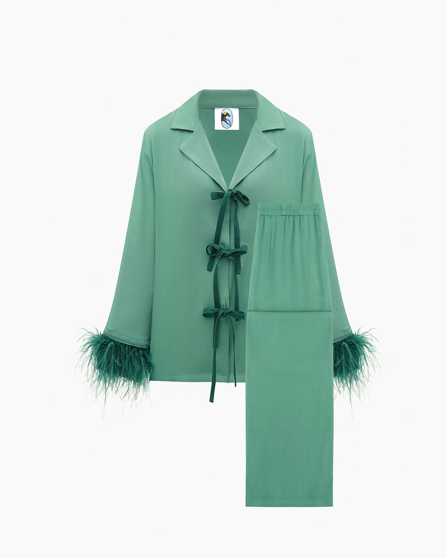 A fresh icon in Sleeper’s legendary lineup of Party Pajamas.This emerald green iteration brings a dose of playful sophistication to your wardrobe — perfect for nights that call for drama or days that deserve a little more delight. Crafted in soft certified viscose and finished with velvet bows and detachable feather cuffs, this set is as versatile as it is glamorous.