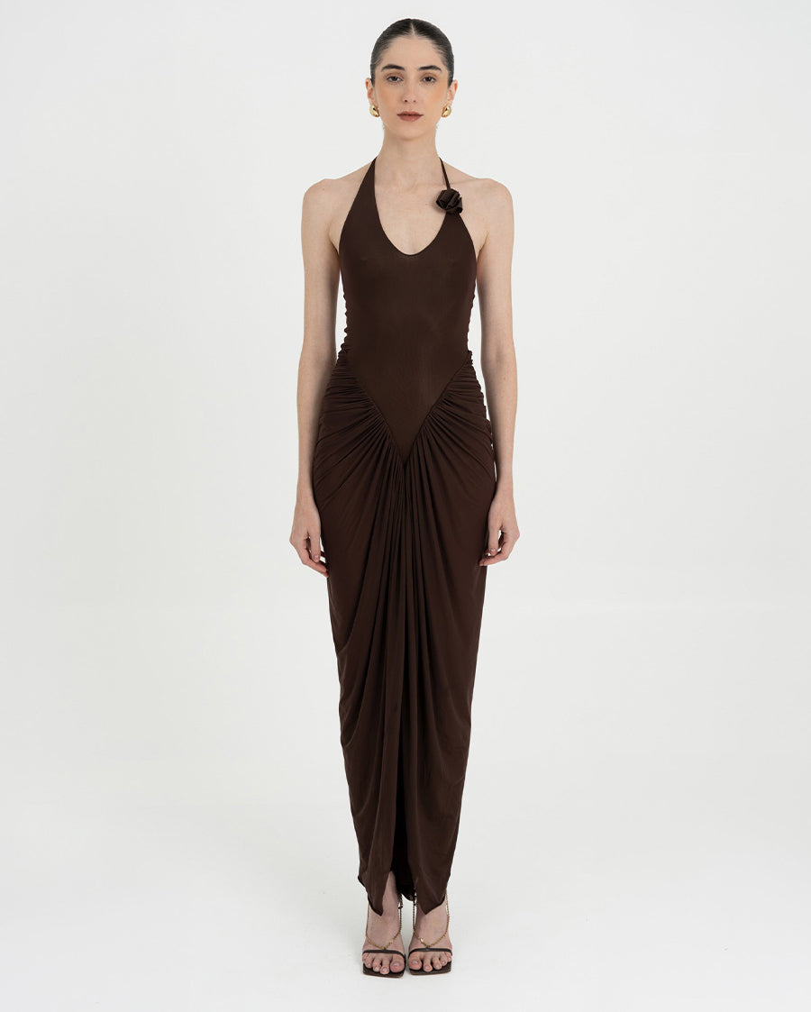 The Vestalia long dress features an asymmetric halter neckline with a deep-U shaped finish. One side extends into the neck tie, while the other is accented with a sculptural 3D floral detail and a delicate strap to the neck. The bodysuit offers a flawless second-skin fit and flows into a deep V that continues into a dramatic, fully ruched column skirt, creating a striking and elongated silhouette.