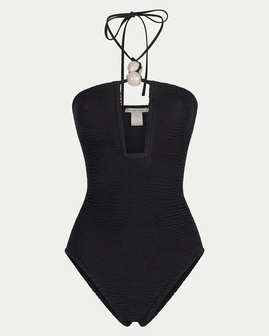 Swimsuit set ADRIANA by PARAMIDONNA. The universal size of the model fits sizes XS to 2XL. The model has ties that connect the chest and ties around the neck with decorative two pieces of round accessories in pearl color. The front of the model has a built-in banel in a U-shape and beautifully highlights the neckline, while the back is mid-cut. The ADRIANA swimsuit has a shaping effect and provides support and comfort to the chest, while the fabric adds a unique elegance and style. Innovative and fashionable this model guarantees you style.
