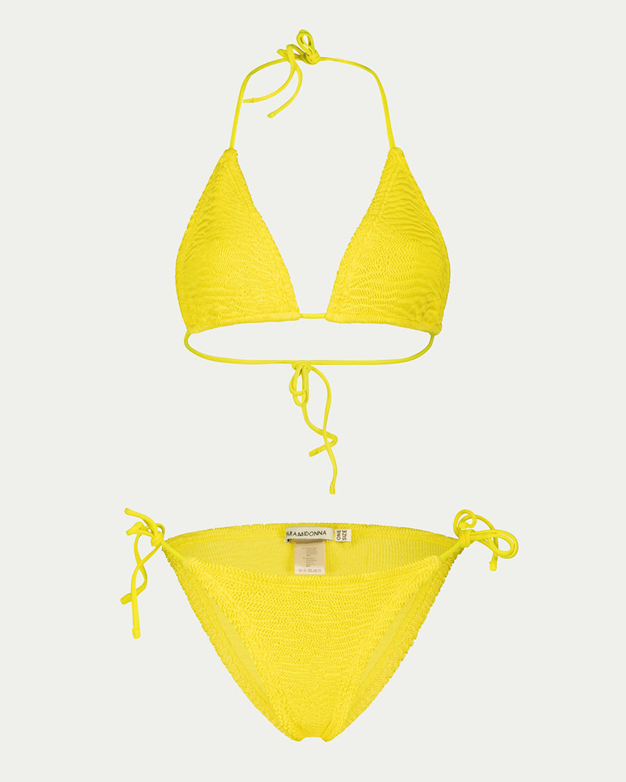 Timeless and refined, the EMA swimsuit set embodies understated elegance with a universally flattering silhouette. The top features classic triangular cups, designed to sculpt and support, while delicate ties at the neck and back allow for a personalised fit. The bottoms mirror this adjustability with elegant side ties, ensuring comfort and versatility. Crafted from luxuriously soft, high-quality fabric with exceptional elasticity, EMA adapts seamlessly to a range of body shapes—from XS to 2XL, offering both style and ease.