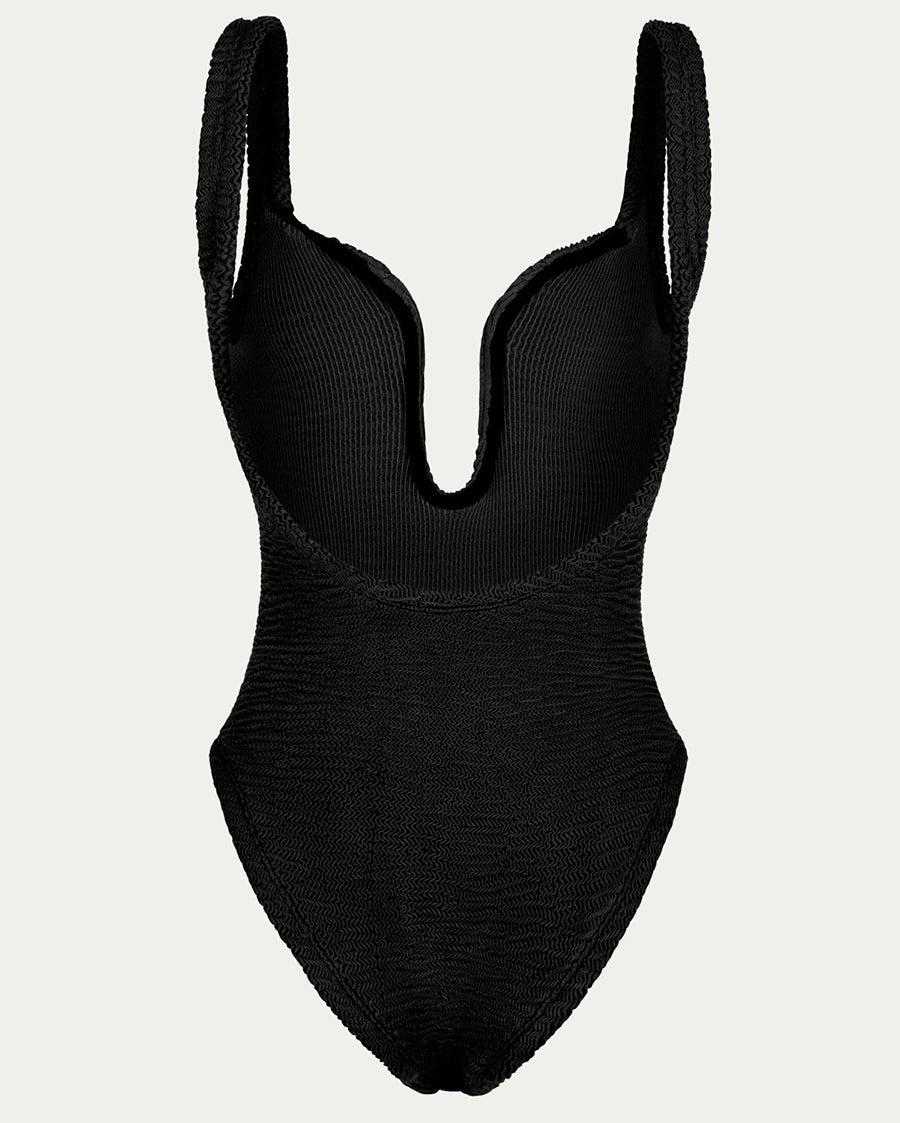 The MIKA swimsuit is created in a universally flattering size, designed to embrace silhouettes from XS to 2XL with effortless ease. The front features a deep, plunging neckline adorned with a delicately integrated underwire, subtly enhancing the bust while gracefully framing the décolletage. The back reveals an open silhouette, elegantly balanced by two slender shoulder straps that ensure both stability and lift. Renowned for its flattering shaping effect, the MIKA model offers gentle contouring across the body and reliable support for both smaller and fuller natural busts. This piece offers a seamless blend of comfort, support, and elegance.