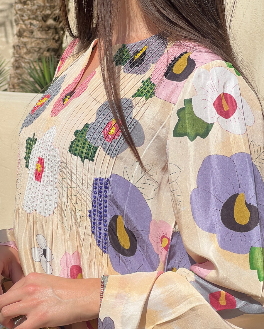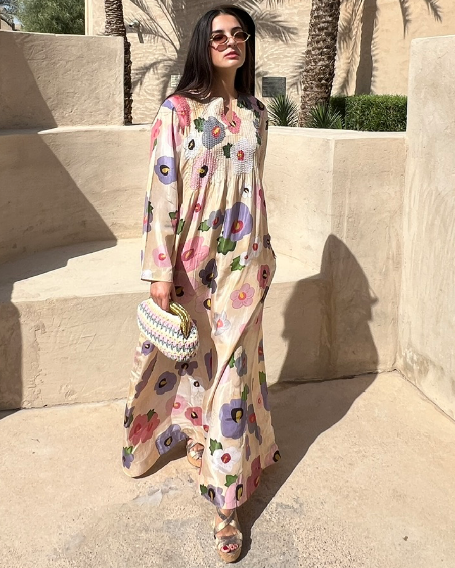 Cream HT Silk Round Neck with V-Slit Opening Pin Tucks on Front Sequin & Bead Work Hand Emb Highlight on the Print Rose Eclipse Digi-Print Jalabiya Kaftan
