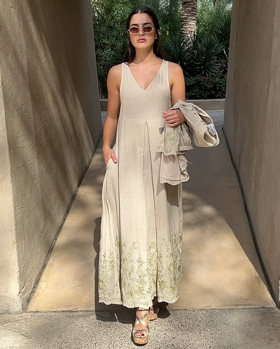 Elevate your wardrobe with this stunning two-piece ensemble featuring delicate lily flower embroidery adorned with shimmering lurex details. The natural tone creates a timeless, sophisticated look that transitions effortlessly from day to evening. The coordinating jacket adds versatility and polish, while the flowing gown offers comfort and elegance. Perfect for special occasions or when you want to feel absolutely radiant.
