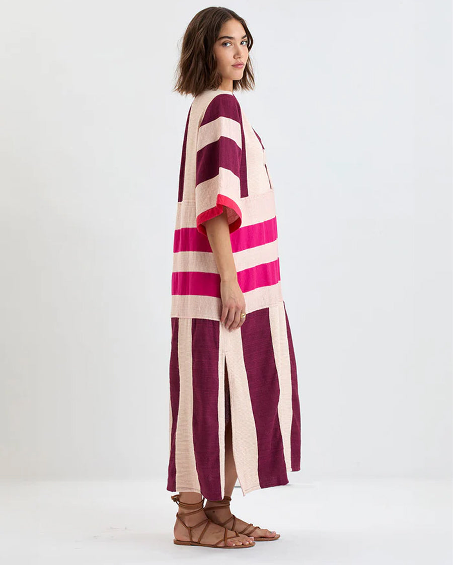 The Betami Cherry Collection features a striking color-block combination of vivid magenta, scarlet, and burgundy with neutral cream and white, inspired by handmade quilting and African textiles.