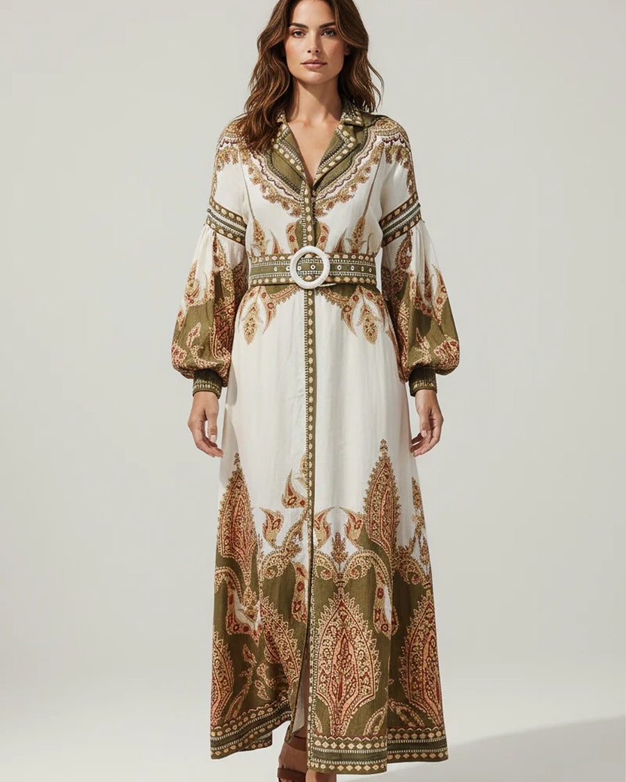 Command attention in the FLORISTA LONG DRESS, crafted from our luxurious, signature linen-viscose blend. Fitted at the waist with a lapel collar and smocked sleeve endings, it features a full open front with an engineered placement paisley print. A detachable buckled belt accents the silhouette, while hand-beaded artisanal work running across the print enhances the look. Perfect for any occasion, this dress blends artistic inspiration with meticulous detailing, offering versatility and elegance for your wardrobe.