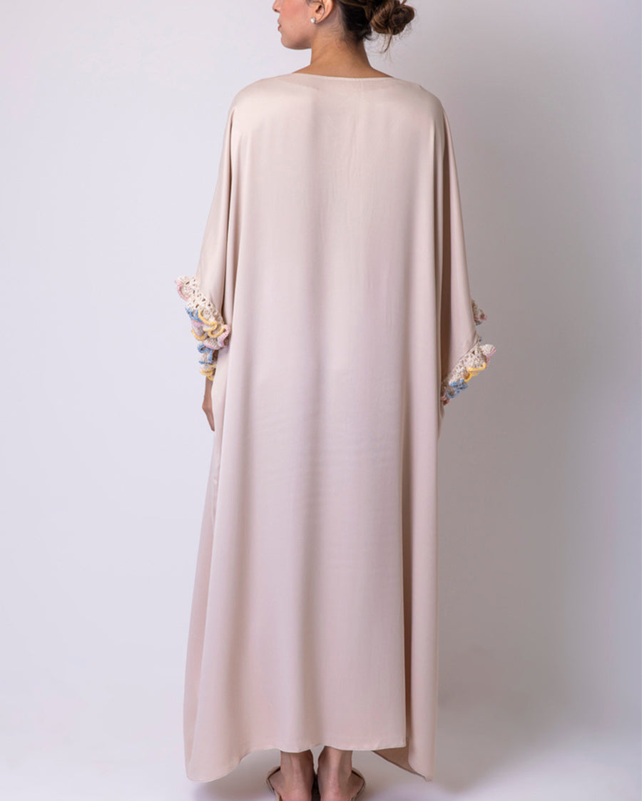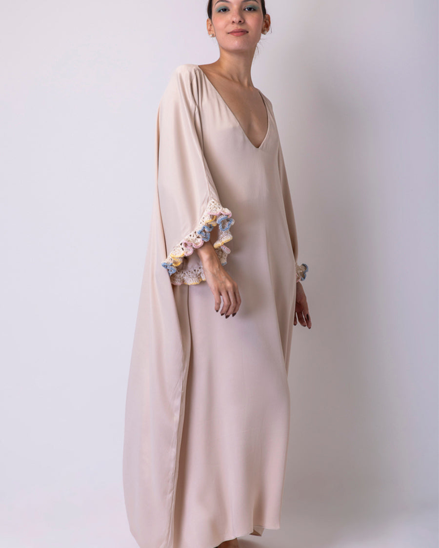 The Long Kaftan is a piece that blends lightness and sophistication. Made from flowing viscose fabric, it has a soft touch and a loose drape. Its wide silhouette ensures comfort and freedom of movement, while the sleeves with handmade crochet applications add texture, delicacy, and a special charm. A versatile classic that combines elegance and natural ease.