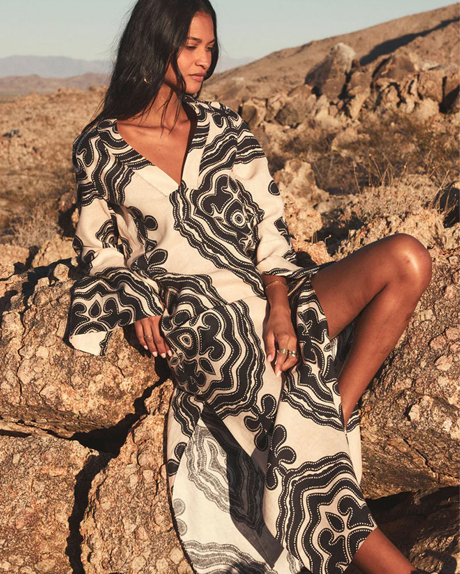 This chic column dress has a popover V-neckline and a slim maxi silhouette. It features long bell sleeves for an elegant, tailored look. Its relaxed, flowing design creates a chic and bohemian silhouette. Form-fitting around the chest with a relaxed, flowy silhouette for the body.
