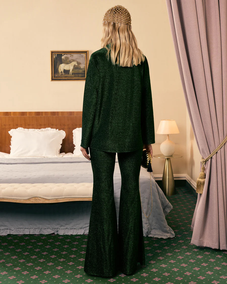 A shimmering lurex ensemble designed for moments of light and ease. The voluminous blouse with tie-front bows and the softly tapered trousers create a silhouette of measured glamour. Fluid in movement and radiant in texture, it transitions naturally from evening gatherings to quiet hours at home.
